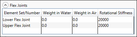 The structural properties of a flex joint are characterised in terms of a rotational stiffness, and it may optionally have associated weights in air and in water. The upper and lower flex joints for this example are assigned properties as shown in the figure below. Refer to Hinges and Flex Joints for further information on this feature.