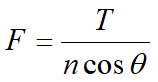 where F is the tension in each tensioning line, T is the specified total vertical tension to be applied to the riser, n is the number of tensioning lines, and θ is the fleet angle. This ensures that the total vertical force applied to the riser is equal to the required top tension value. If you examine the Flexcom keyword file, you will see how Parameters and Equations have been used to compute the required parameters such as fleet angle, and tension within each line.