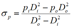 In the representation on the left, σtw represents the “true wall” axial stress as defined in Axial Stress (Eq.1). σc is the circumferential or hoop stress, and σr is the radial stress. σtw is as noted constant over the section, but σc and σr are functions of r, the radius. However, the mean of the two stresses is everywhere constant, and alternative expressions for σc and σr may be written using Lamé’s equations as follows:
